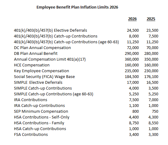 The IRS has released the cost-of-living adjustments for various retirement and benefit plan limitations that will take effect January 1, 2026. Please see a few of note below: